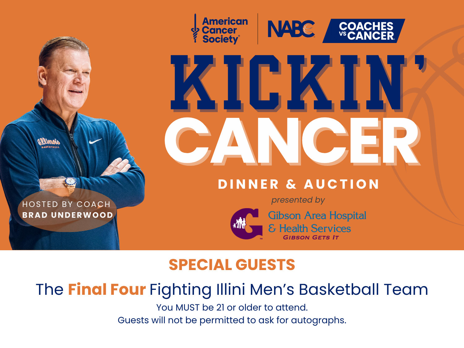 Let’s celebrate Coach Brad Underwood and the Final Four Fighting Illini Men’s Basketball Team! This year, the Kickin’ Cancer Dinner & Auction presented by Gibson Area Hospital will honor the incredible season of this team while raising money for the fight against cancer.